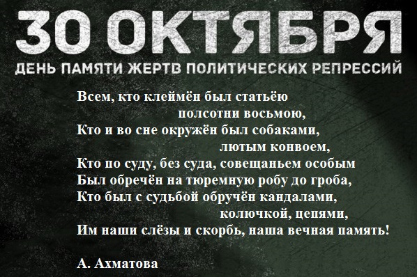Этот день в России отмечается ежегодно 30 октября. Трагедия первой половины 20 века коснулась судеб многих и многих граждан огромной страны, попавших в жернова массовых арестов, выселений, расстрелов.