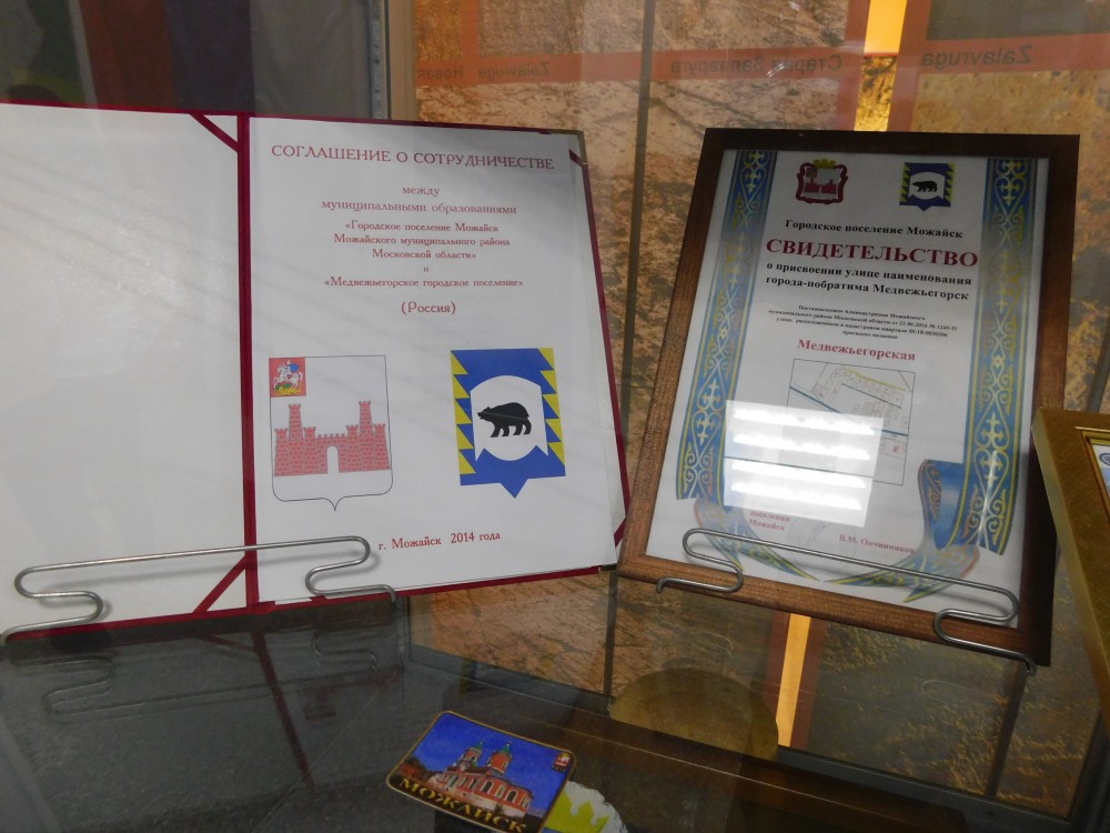 В Медвежьегорском районном музее открыта новая выставка «Можайск-город побратим!». В 2014 г. Можайск подписал соглашение с Медвежьегорском, в 2015 - Можайский район с Медвежьегорским районом. В рамках данного сотрудничества Главы запланировали ряд совместных проектов по развитию деловых связей между хозяйствующими субъектами районов, работающими в области туризма и выставочно-ярмарочной деятельности, также обе стороны поощряют сотрудничество и содействуют установлению контактов между спортивными организациями.