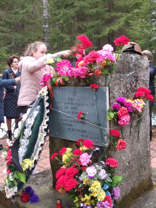 Накануне 78-летия Великой Победы в рамках патриотического проекта "Память жива" состоялся митинг на месте гибели поэта Бориса Смоленского, павшего в бою за Медвежьегорск близ п. Падун. В памятном митинге приняли участие ученики и учителя Медвежьегорской школы №1, Глава Медвежьегорского района В.М. Степаненко, депутат Законодательного Собрания Республики Карелия Г.В. Алупова, идейный вдохновитель проекта Л.И. Зайцева, сотрудники музея, жители города и п. Падун. Память поэта и всех героев, сражавшихся на фронтах Великой Отечественной войны, участники митинга почтили минутой молчания и возложили цветы к монументу. После завершения памятного мероприятия присутствующие долго не расходились, всем было о чём подумать, кого вспомнить...