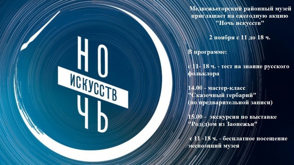 2 ноября Медвежьегорский районный музей приглашает на ежегодную акцию "Ночь искусств". В рамках акции вы сможете проверить себя на знание русского фольклора, посетить новую выставку музея "Кижи" "Род(д)ом из Заонежья", изготовить волшебный гербарий. Ждём вас с 11 до 18 ч!