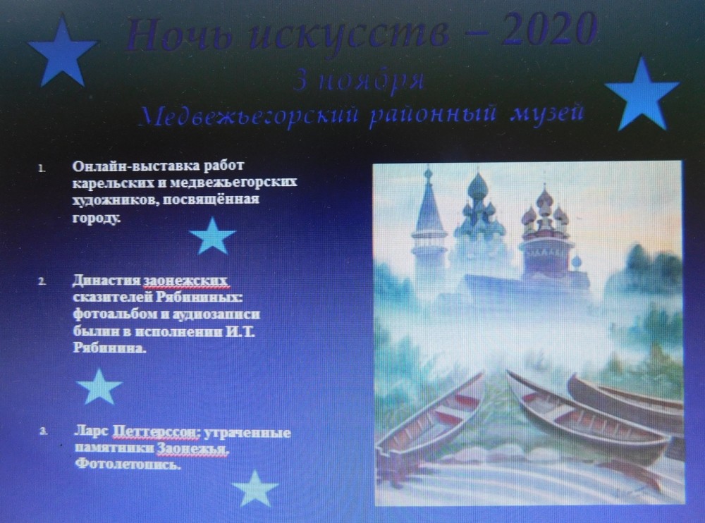 Медвежьегорский районный музей приглашает жителей города и района принять участие в VIII Всероссийской культурно - образовательной акции «НОЧЬ ИСКУССТВ - 2020», которая состоится 3 ноября