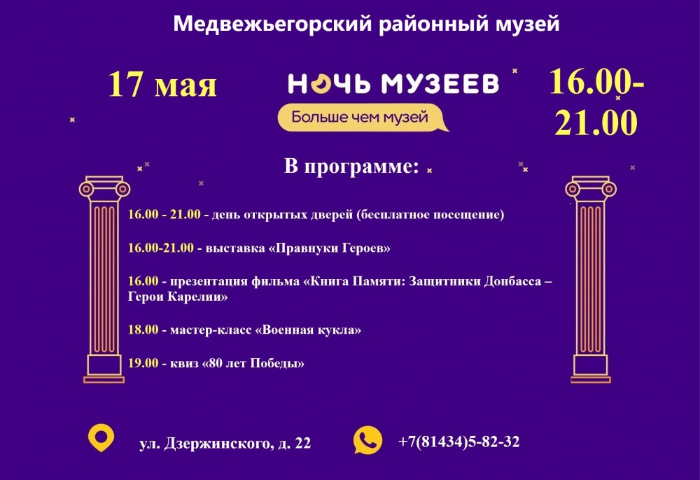 Уважаемые жители и гости города, приглашаем вас в Медвежьегорский районный музей 17 мая (суббота) на традиционную акцию "НОЧЬ МУЗЕЕВ - 2025". Вход свободный. Запись на мастер-класс по телефону +7 (81434) 5-82-32 (до 15 ч. 16 мая). Добро пожаловать!
