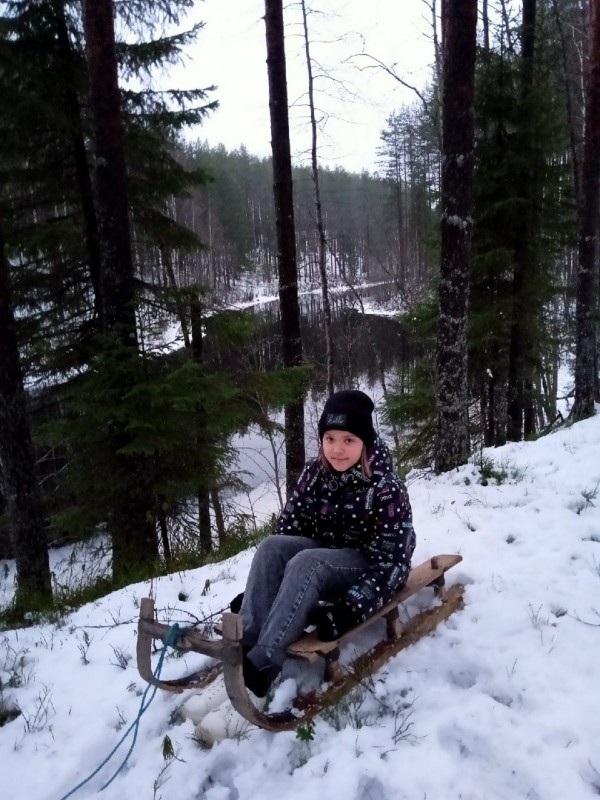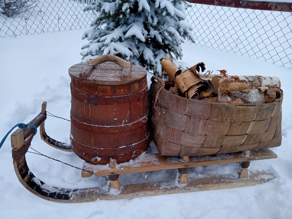 В домашнем музее у меня есть сани (дровни), изготовленные руками отца. В одном из источников прочла, что слово «сани» является русским, позднее его заимствовали в свои языки другие народы, в первую очередь славянские. Слово образуется от термина «сань», обозначающего змея. Аналогия здесь со следом от полозьев, который напоминает очертаниями змею. Отец изготавливал большие сани для различных работ: для перевозки грузов, воды, сена, для подвозки дров от сарая до крыльца. А зимой, в ожидании снежных бурь или студеных морозов, на санках могли подвезти дрова впрок прямо в сени, и тогда можно было в непогоду не выходить за дровами на улицу. Маленькие сани («регют») по форме ничем не отличались от больших, только размерами, отец изготавливал их для забавы детей, чтобы кататься с горок или на озере по льду. Как гласит русская пословица: «готовь сани летом, а телегу зимой», так и мой отец старался заниматься заготовкой деталей для саней в летний период. Для этого необходимо было в солнечный день идти в лес, выбирать хорошую березу. Затем возле сарая он обтесывал дерево, а место будущего гнутия оборачивал в кору и помещал в тлеющий костёр на 2-3 часа. Затем для придания изогнутой формы полозьям ставил заготовки в специальную гнулку («пайним»), которая находилась в сарае, и в таком виде оставлял на сушку на три-пять дней. В полозьях он проделывал гнёзда для парных копыльев – это бруски для скрепления. На копыльях укреплялись два бруска – грядки. Головки полозьев скреплялись с передними концами брусков–грядок верёвкой или проволокой. Сверху на санки укладывались доски.